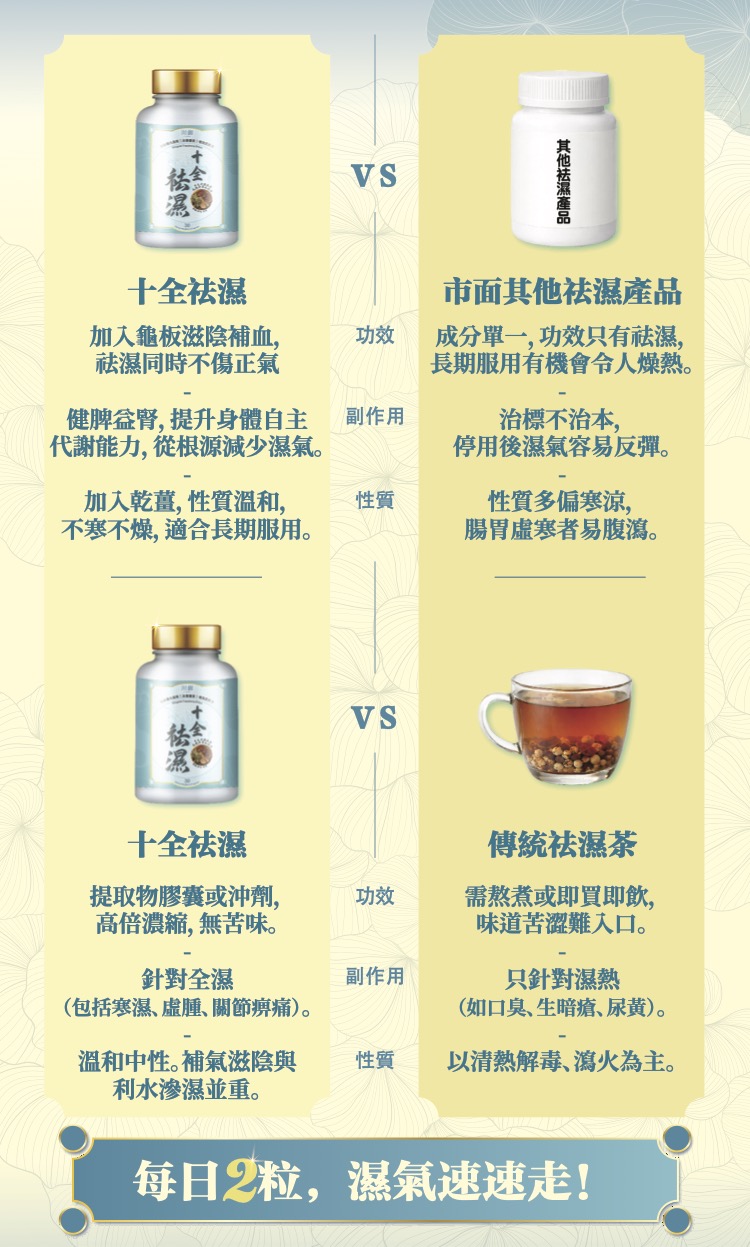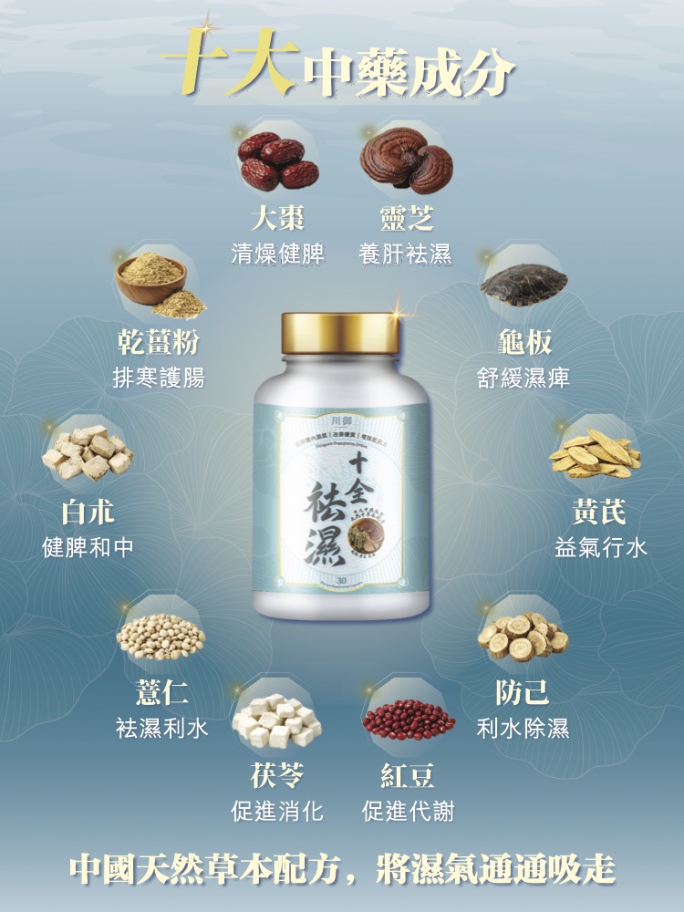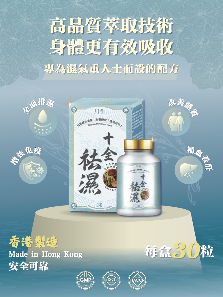 川御 十全祛濕以標本兼治為核心,結合薏仁、茯苓等利水草藥加速排出多餘水分,消除肢體沉重與水腫。同時加入龜板滋陰補血,並配合靈芝提升免疫力。這套配方不僅能緩解表面的濕氣症狀,更能調理脾腎功能,幫助身體找回自主代謝水分的平衡狀態,達到袪濕不傷身的深度固本效果。