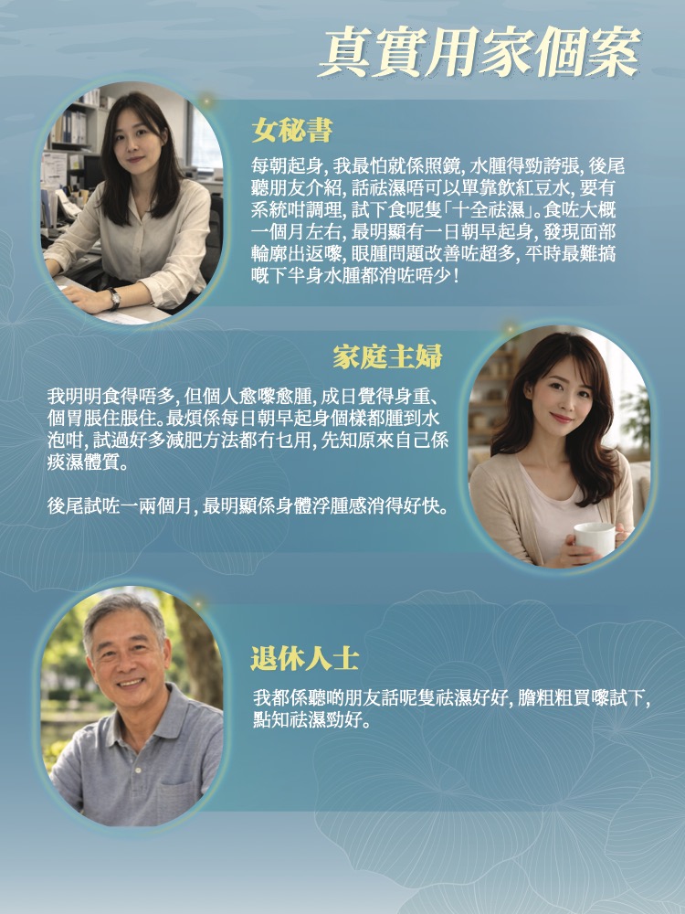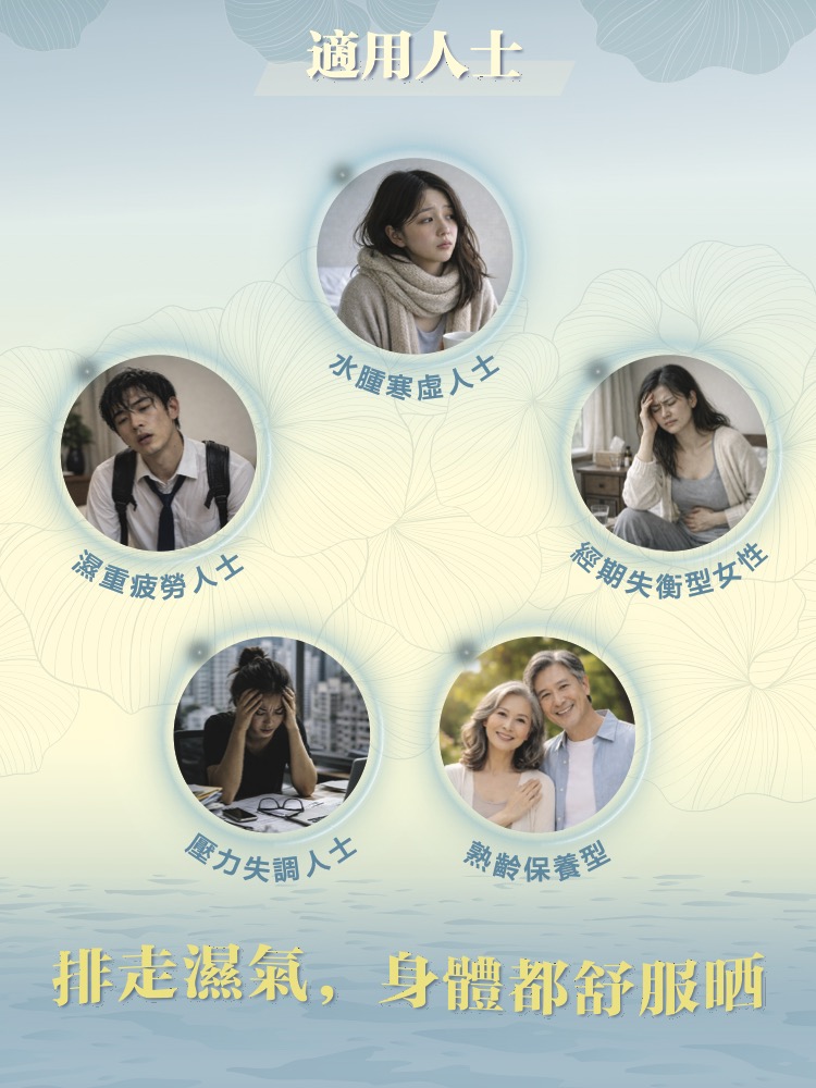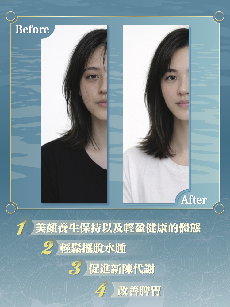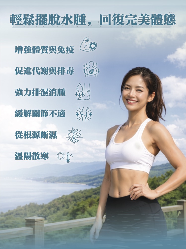 透過系統性的體質調理,您將感受到身體由內而外的轉變。除了有效消除虛胖水腫、重塑輕盈體態外,更能改善脾胃運化,減少腹脹與疲勞感。當體內濕氣排淨,精神將不再昏沉,膚質也會因代謝優化而變得清爽細緻。每日簡單調理,即可擺脫濕氣束縛,讓身體恢復輕盈活力,展現健康神采。