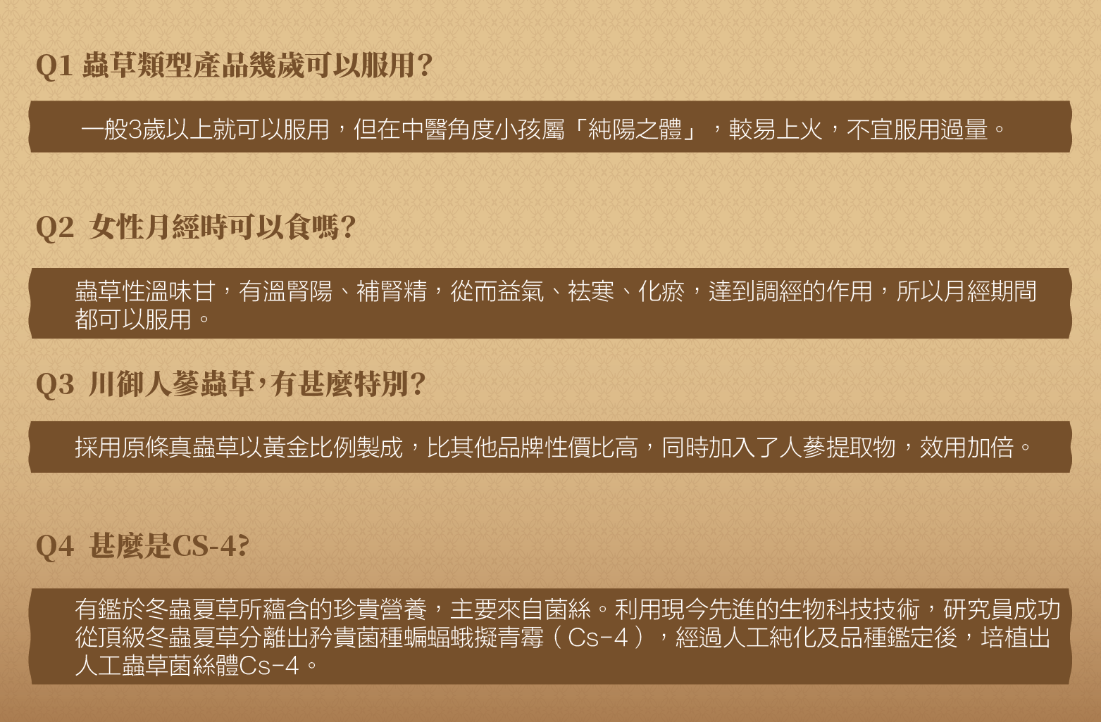 產品說明川御蟲草CS-4(Cordyceps Sinensis菌絲體)是一種名貴的傳統中藥材,具有多種保健功效。它富含多糖、腺苷和多種氨基酸,能增強免疫力、抗疲勞、抗炎、抗腫瘤、保護肝臟、降血脂、調節血糖、增強性功能、改善呼吸系統功能及延緩衰老。川御蟲草CS-4經過現代生物技術培育,保留了天然蟲草的營養成分,是一種高效、安全的健康補品,適合日常保健和病後恢復使用。成分:蟲草CS-4 精華,食用膠囊建議用法:每日1次,每次2-3粒規格:每樽60粒,每粒500亳克生產地:香港製造Made in Hong Kong注意:小童、孕婦不宜服用Caution: Not suitable for children and pregnant women貯存:避免陽光直射,請存放於陰涼乾爽處Storage: Avoid direct sunlight, please store in a cool and dry place
