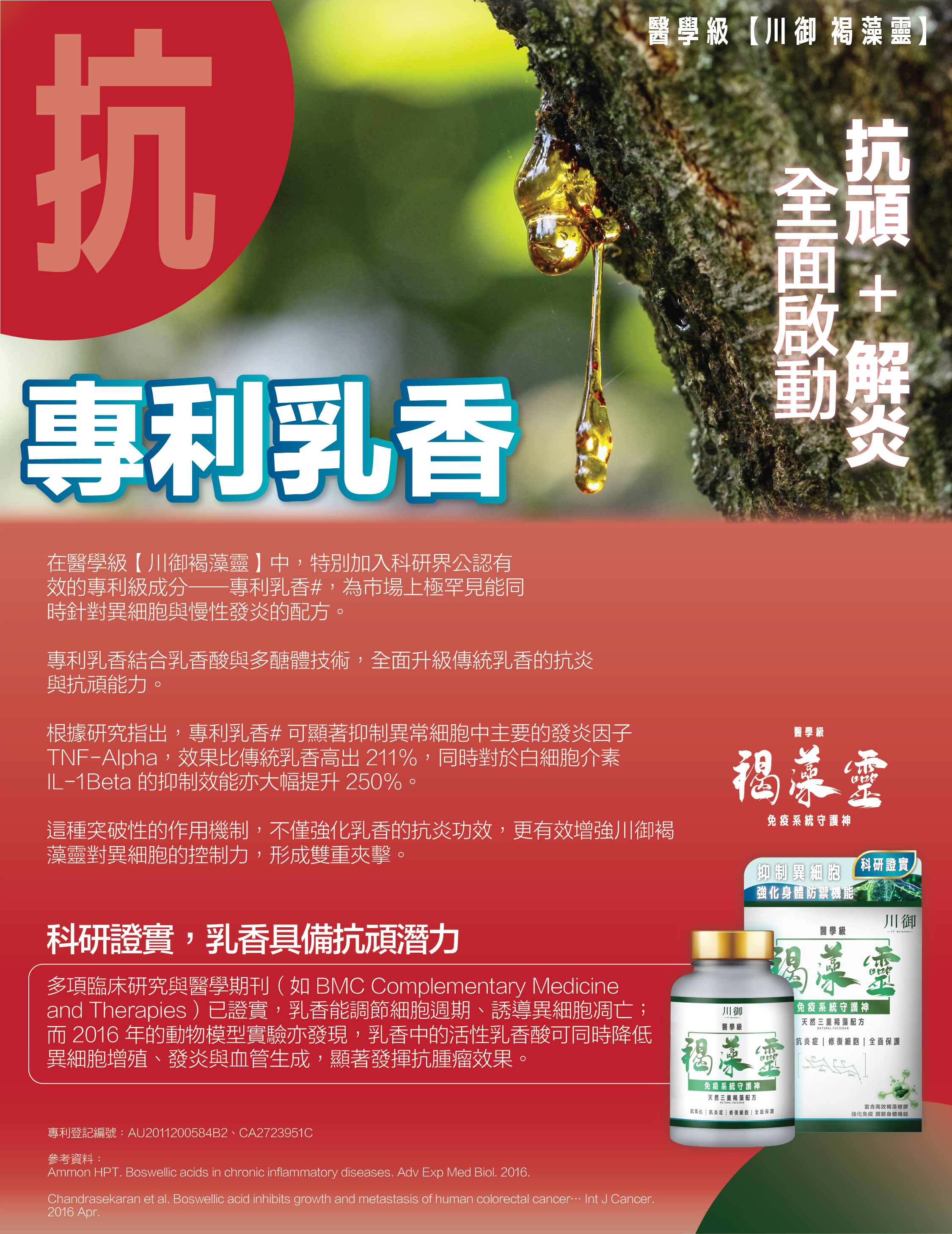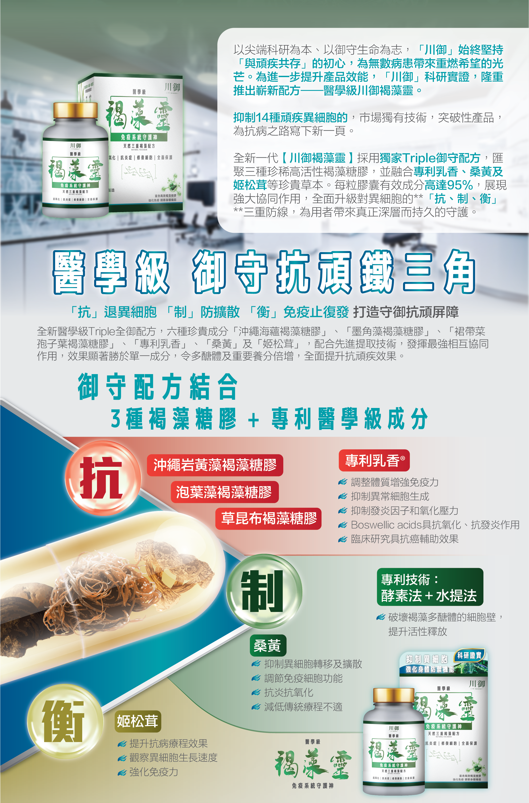 川御醫學級褐藻靈專為現代人打造全方位免疫防護。核心成分包括300mg高劑量桑黃,具備優異的抗氧化、抗菌及抑制異常細胞增生的能力,可強化免疫系統、延緩老化;10mg珍稀姬松茸,能提升免疫細胞活性,並對異細胞具有天然抑制作用,具抗腫瘤與抗炎潛力;更特別添加來自60%「沖繩岩黃藻褐藻糖膠」、30%「泡葉藻褐藻糖膠」、10%「草昆布褐藻糖膠」的三重褐藻糖膠(25mg),對抗異細胞、病毒與發炎反應,增強身體修復與防禦能力。配方中加入乳香,有助舒緩頑症不適、減輕炎症並促進血液循環,特別適合中老年人或有頑症人士。
