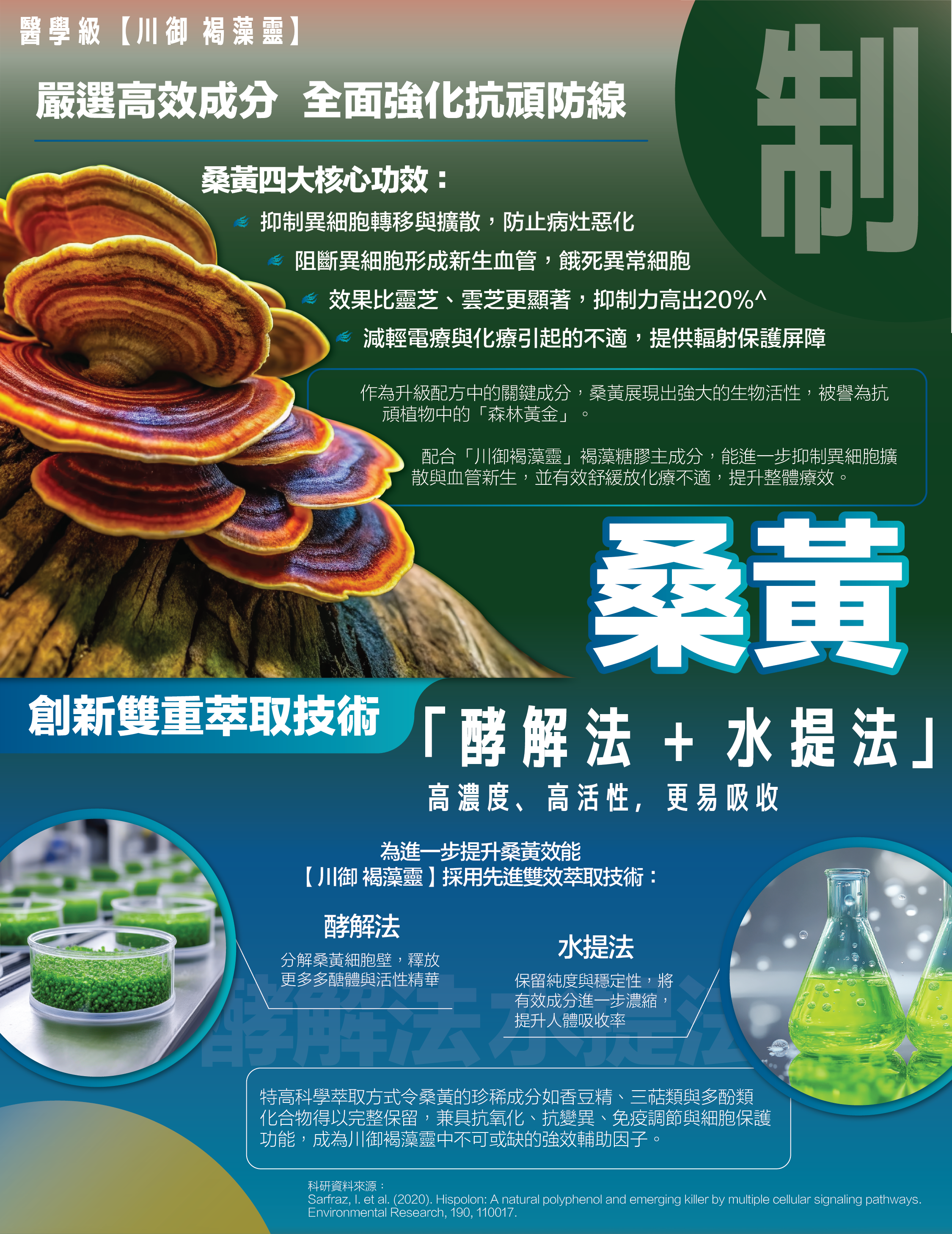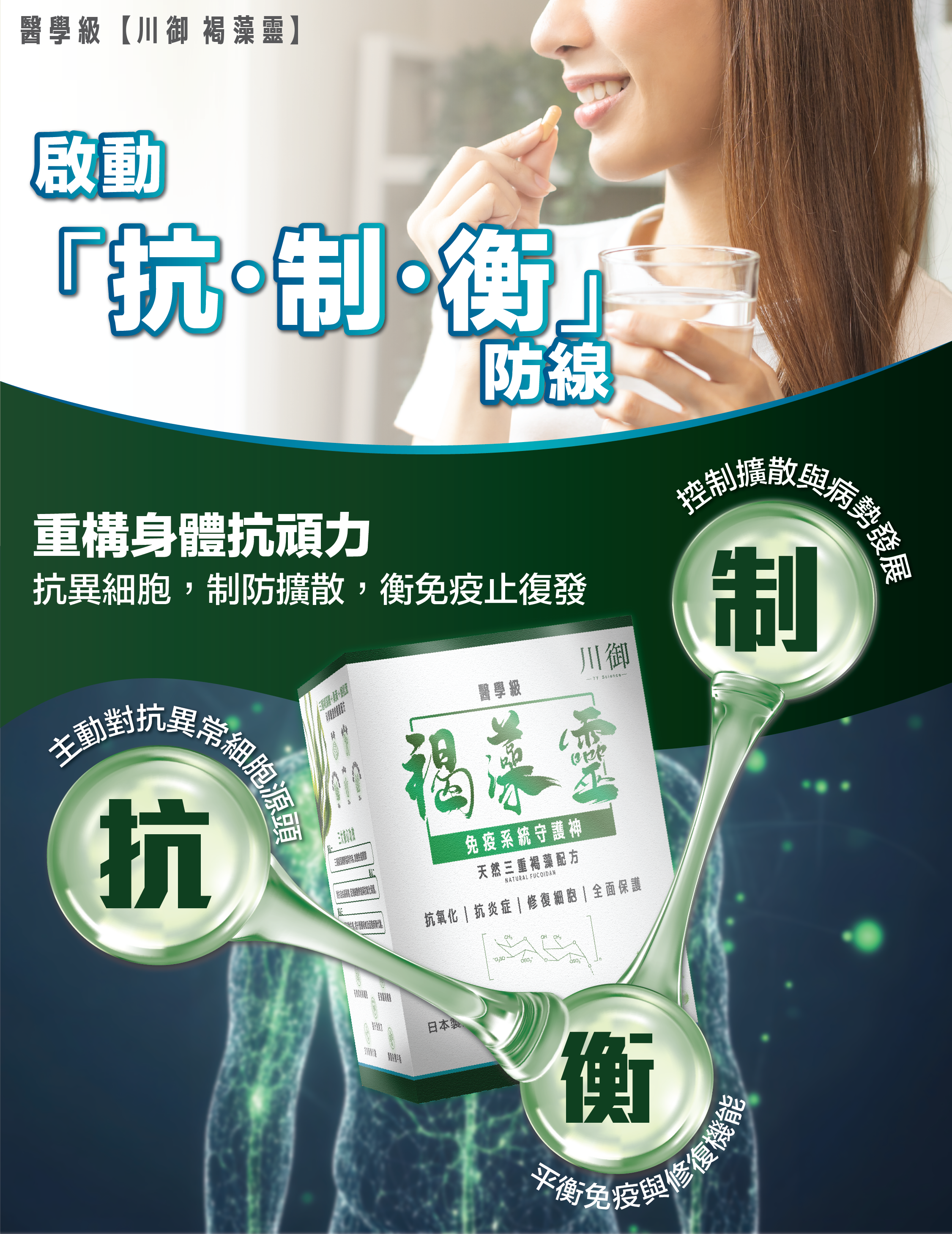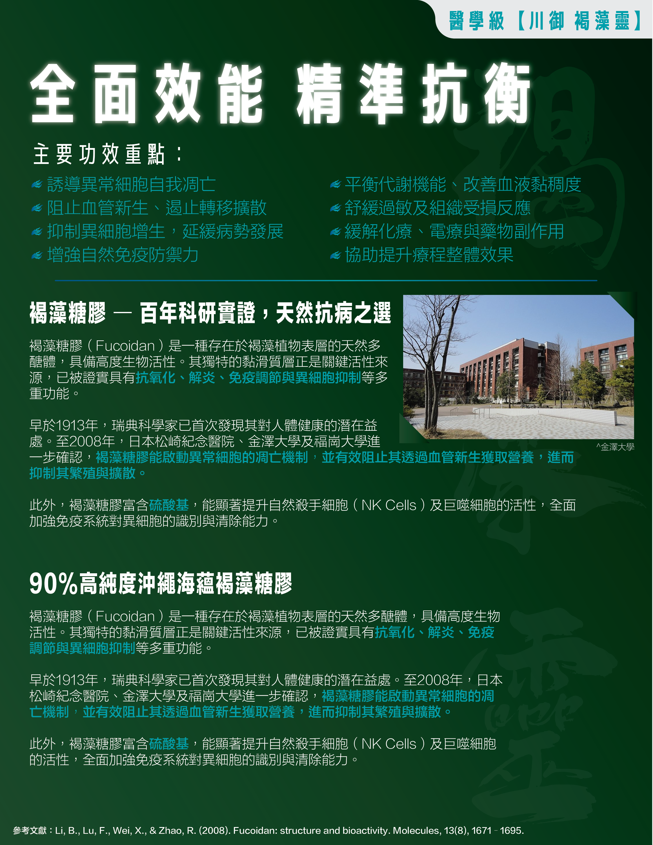 川御褐藻靈含褐藻糖膠(Fucoidan)經科學研究證實,可促進細胞自噬,支持心血管健康及提升免疫力,有助活化免疫細胞,增強身體對抗外來侵害的能力(Yonsei University, 2005)。日本琉球大學研究亦證實,Fucoidan可誘導異常細胞凋亡,促進身體自我修復(Ryukyu University, 2009)。